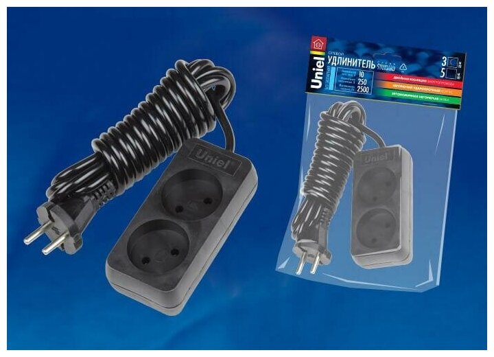 Отзывы на Uniel Удлинитель Uniel Standart, 2 розетки, 3 м, 10 А, 2500 Вт, без з/к, черный