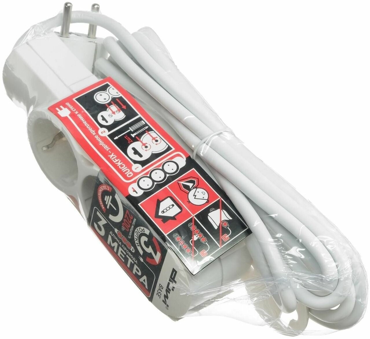 Удлинитель 3 розетки, 3 м, 10 А, 2200 Вт, ПВС 3x0.75 мм2, с заземлением, белый