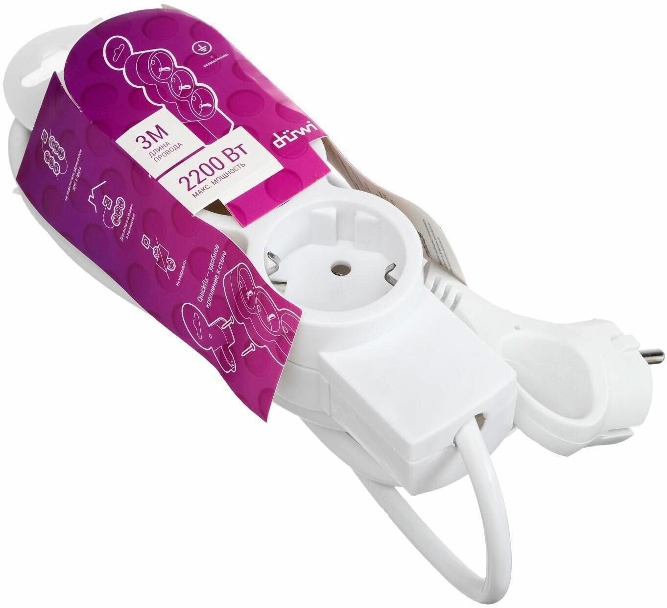 Удлинитель Duwi, 3 розетки, 3 м, 10 А, 2200 Вт, ПВС 3х0.75 мм2, с з/к, белый (1 шт.)