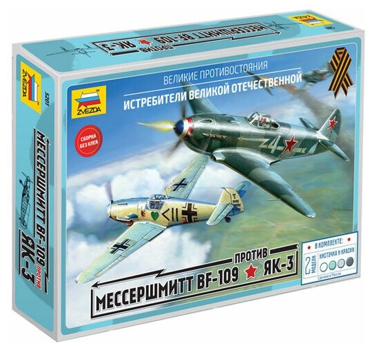 | Комплектация | сборная модель истребителя Мессершмитт BF - 109 / состоящая из 42 деталей в масштабе 1/72; сборная модель истребителя Як - 3 / состоящая из 46 деталей в масштабе 1/72; кисточка и краски (4 цвета); инструкция по сборке; красочная брошюра с интересными фактами об истории создания и боевом применении данных истребителей |