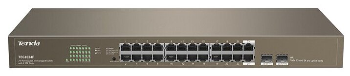 Коммутатор Tenda TEG1024F, 24-портовый неуправляемый гигабитный стоечный , 2 порта SFP, молниезащита 6 кВ