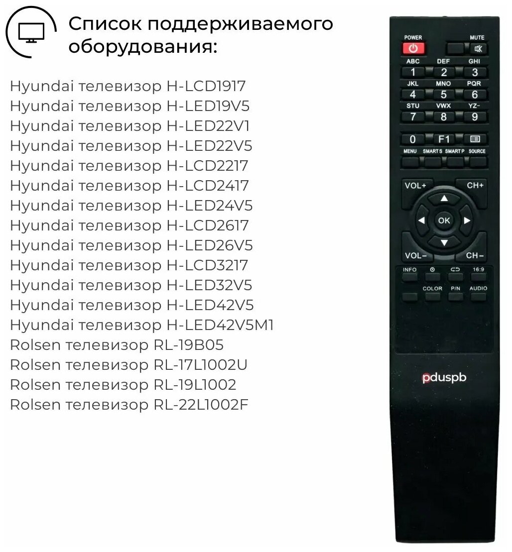 | Назначение | Hyundai H-LCD1917, Hyundai H-LED19V5, Hyundai H-LED22V1, Hyundai H-LED22V5, Hyundai H-LCD2217, Hyundai H-LCD2417, Hyundai H-LED24V5, Hyundai H-LCD2617, Hyundai H-LED26V5, Hyundai H-LCD3217, Hyundai H-LED32V5, Hyundai H-LED42V5, Hyundai H-LED42V5M1, Rolsen RL-19B05, Rolsen RL-17L1002U, Rolsen RL-19L1002, Rolsen RL-22L1002F |