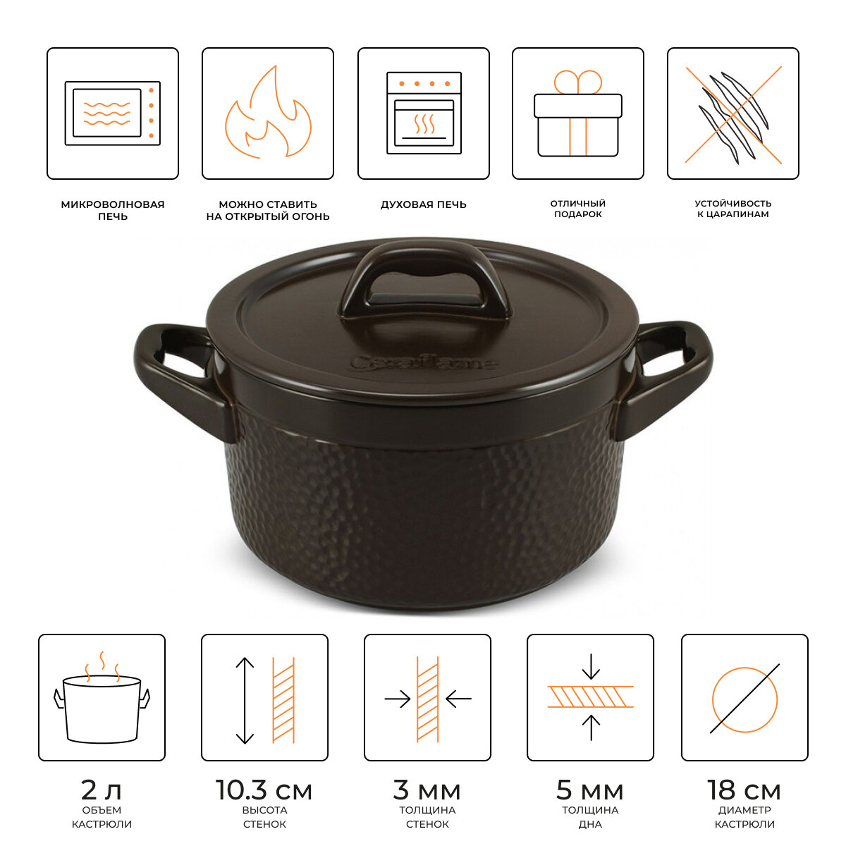 Кастрюля керамическая с крышкой Ceraflame Hammered 18 см, 2 л, шоколад информация: