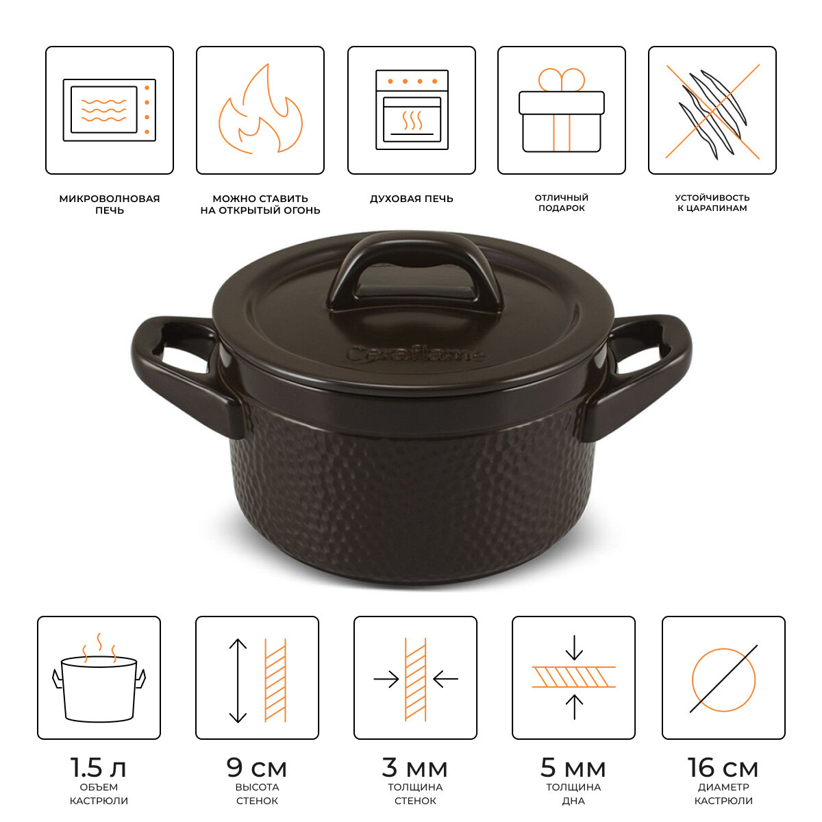 Кастрюля керамическая с крышкой Ceraflame Hammered 16 см, 1.5 л, шоколад информация: