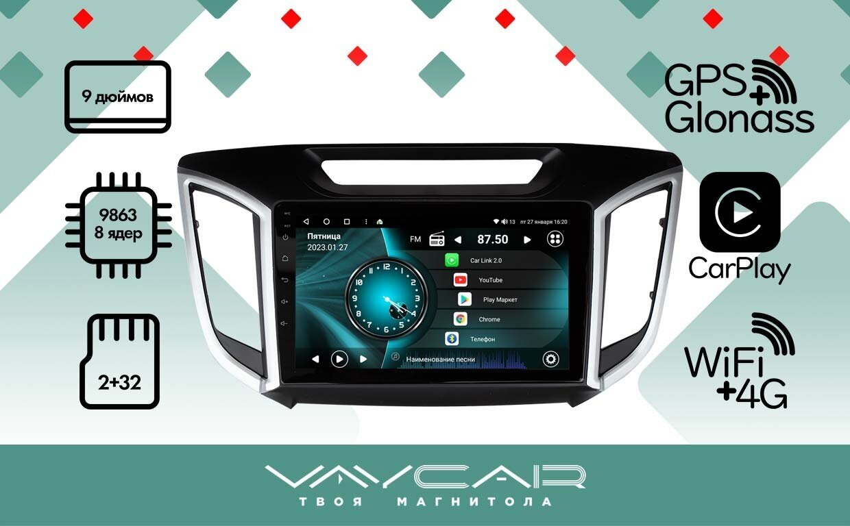 Магнитола Vaycar 09VO4 для HYUNDAI Creta 2016+ (Андроид, 4+64, 8 ядер, WiFi, BT, 4G, GPS, QLED 9")