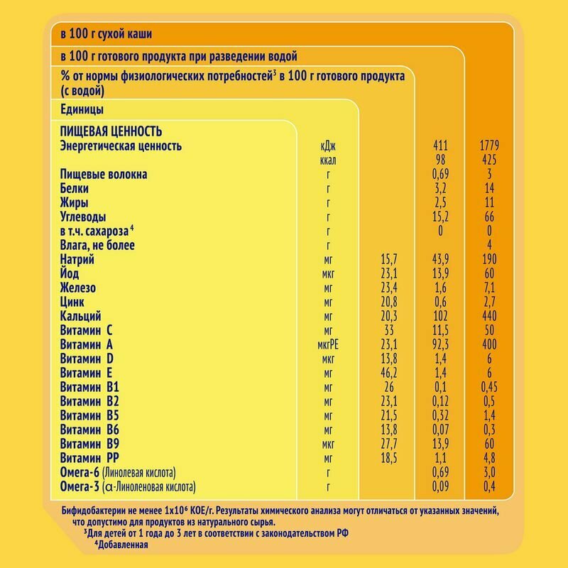 | Состав | мука (пшеничная (57%) (содержит глютен), овсяная (7,9%) (содержит глютен), рисовая (2%), кукурузная (2%)), молоко сухое обезжиренное (16,6%), смесь растительных масел (низкоэруковое рапсовое, подсолнечное высокоолеиновое, подсолнечное), антиокислители (L-аскорбилпальмитат, альфа-токоферол, лимонная кислота), хлопья банана (2,6%), хлопья яблока (1,5%), минеральные вещества (кальция карбонат, железа (II) фумарат, цинка сульфат, йодид калия), витамины (С (L-аскорбиновая кислота), E (DL-альфа-токоферола ацетат), РР (никотинамид), B5 (D-пантотенат кальция), A (ретинола ацетат), В1 (тиамина мононитрат), В6 (пиридоксин гидрохлорид), В2 (рибофлавин), B9 ( фолиевая кислота), D (D3 холекальциферол)), бифидобактерии не менее 1х10^6 КОЕ/г |