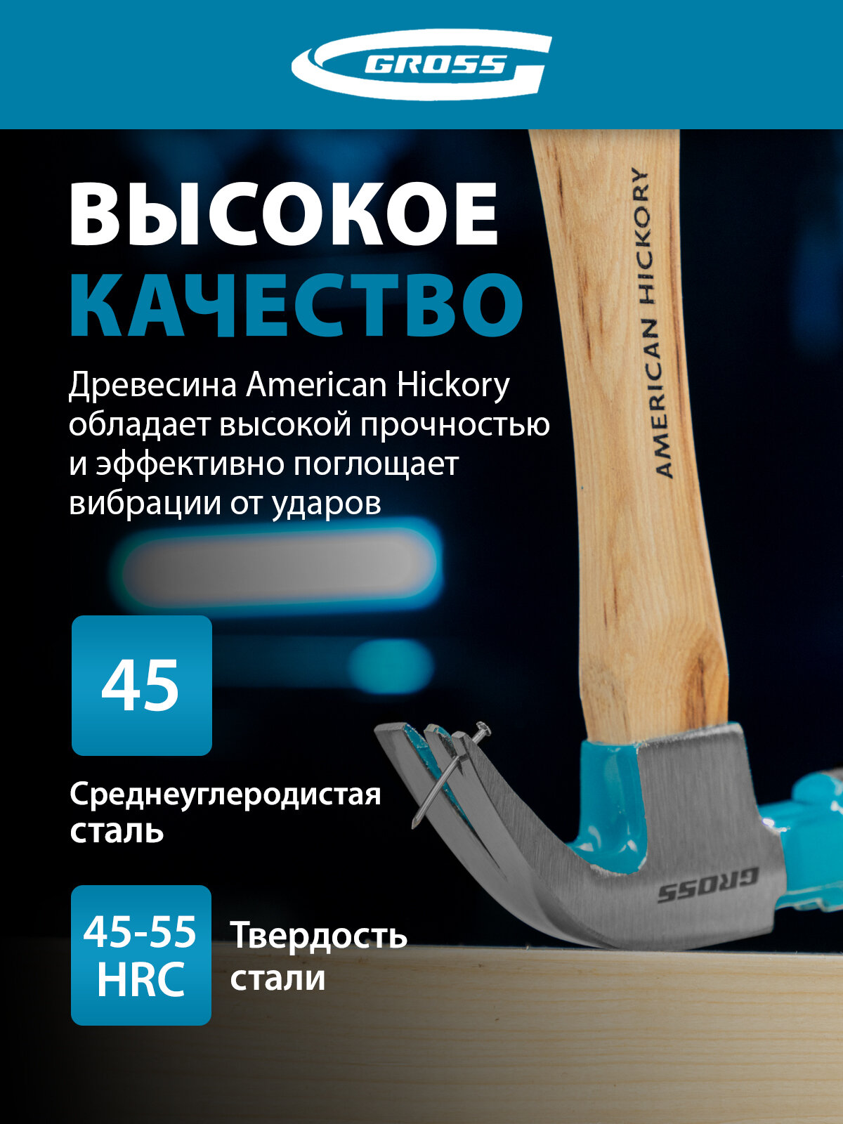 Молоток-гвоздодер GROSS 450 г, угол 75, магнит, обрезиненная рукоятка AMERICAN HICKORY 10418 информация: