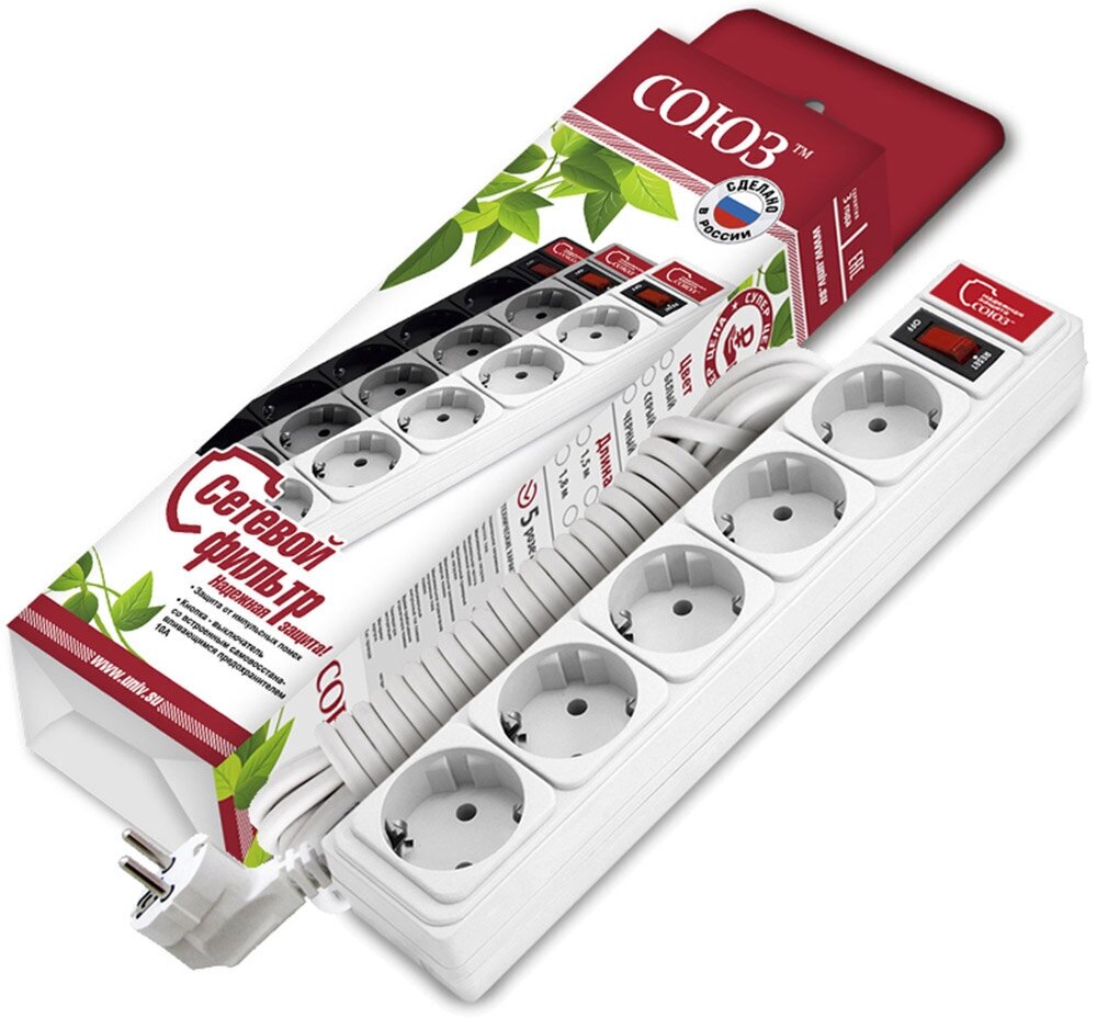 10 цен на Сетевой фильтр "Союз" 5 метров, 5 розеток, ПВС, с заземлением, выключатель с индикацией, белый (Россия)