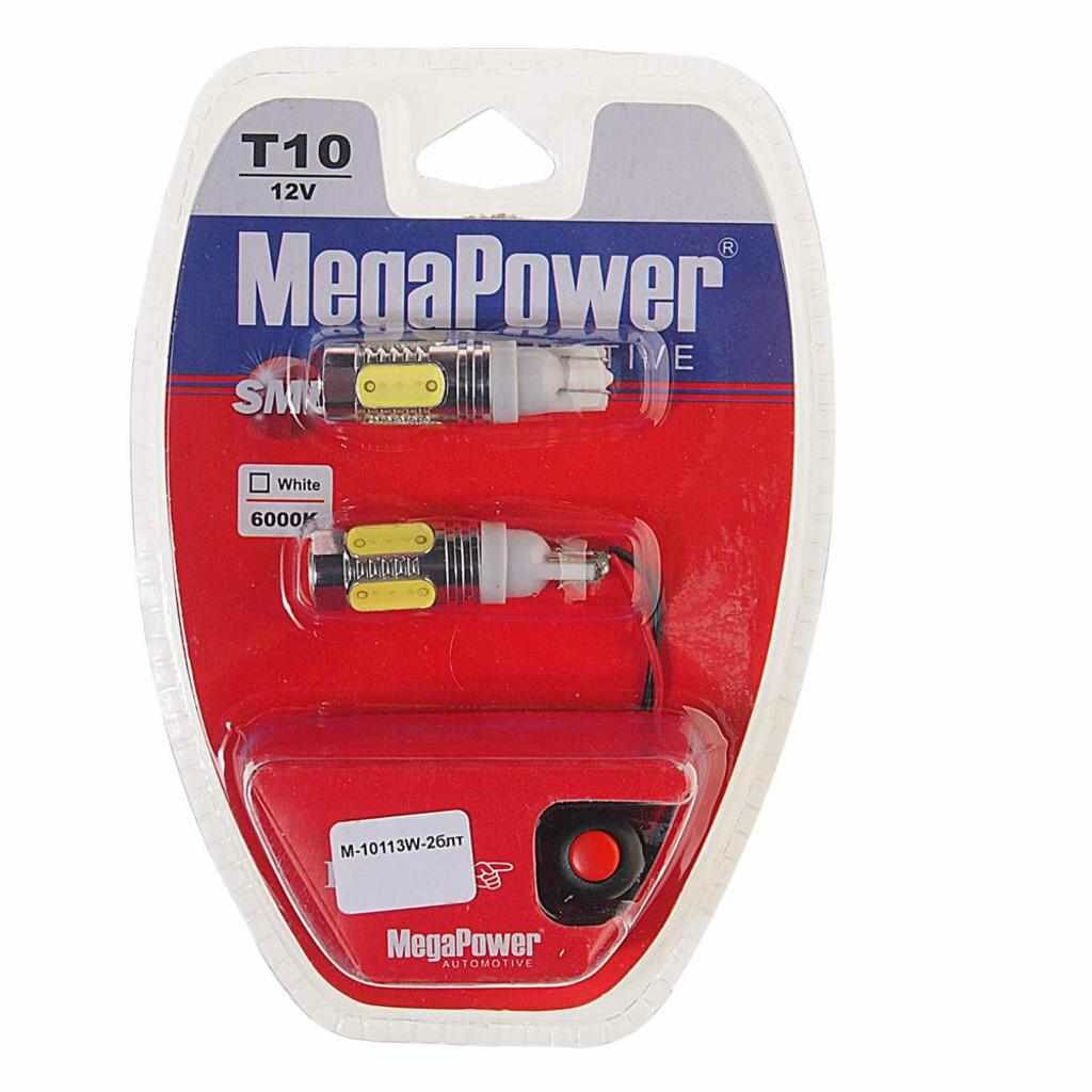 10 цен на Лампа светодиодная 12V W5W T10W W2.1x9.5d 6000K бесцокольная 4 LED блистер (2шт.) с тест., MEGAPOWER 10113W2БЛТ (1 шт.)