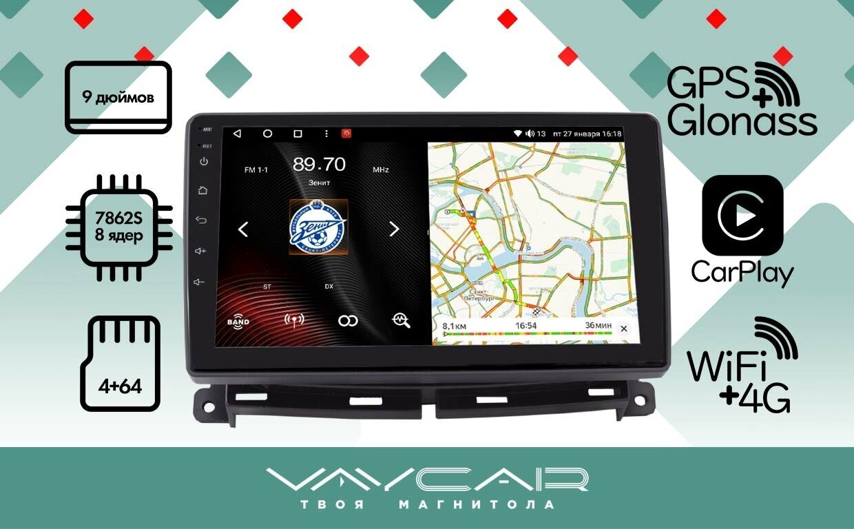 Магнитола Vaycar 09VO4 для SSANG YONG Actyon 2011-2013 (Андроид, 4+64, 8 ядер, WiFi, BT, 4G, GPS, QLED 9")