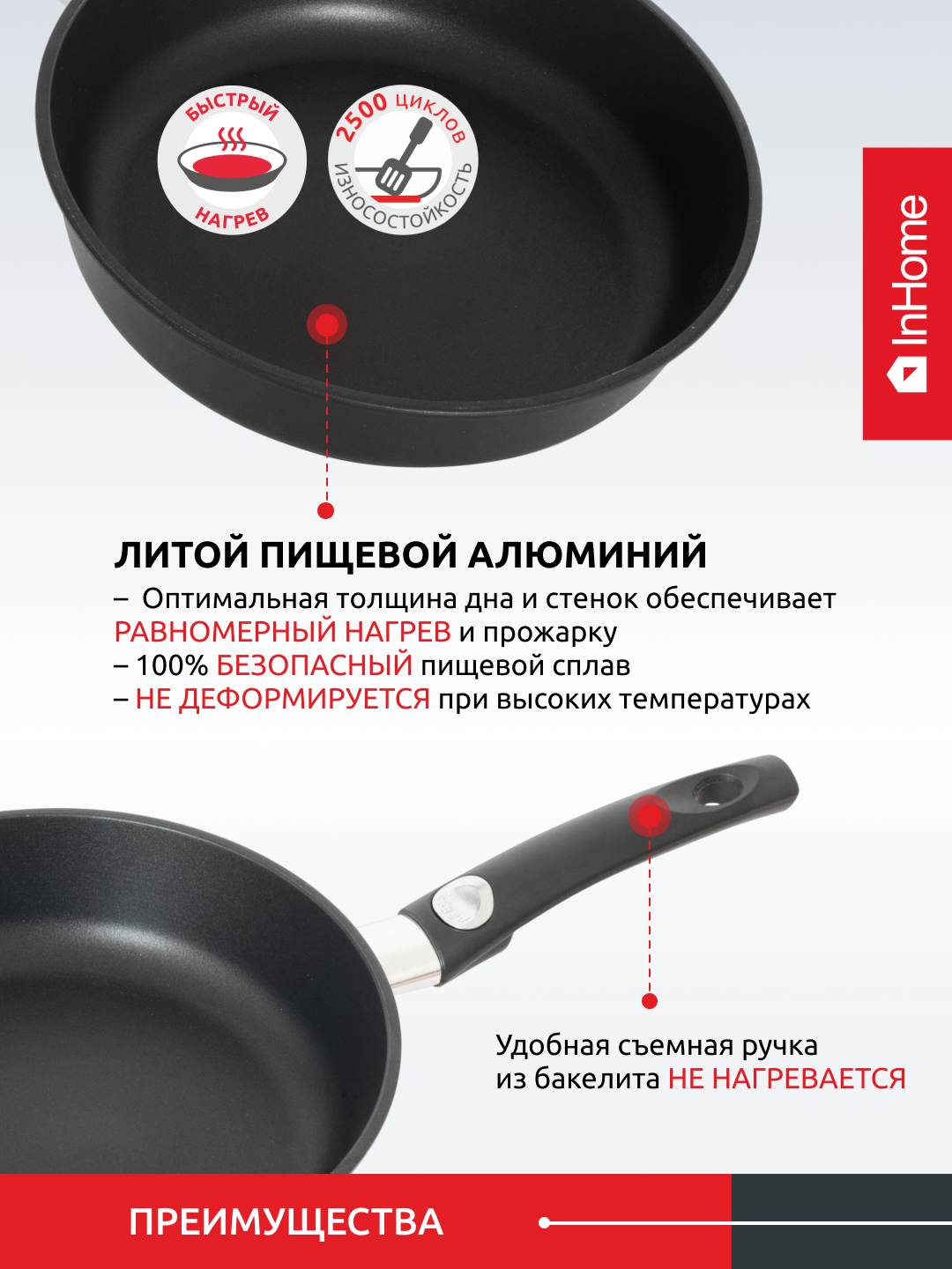 Сковорода InHome классическая литая толстостенная с антипригарным покрытием, съемная ручка