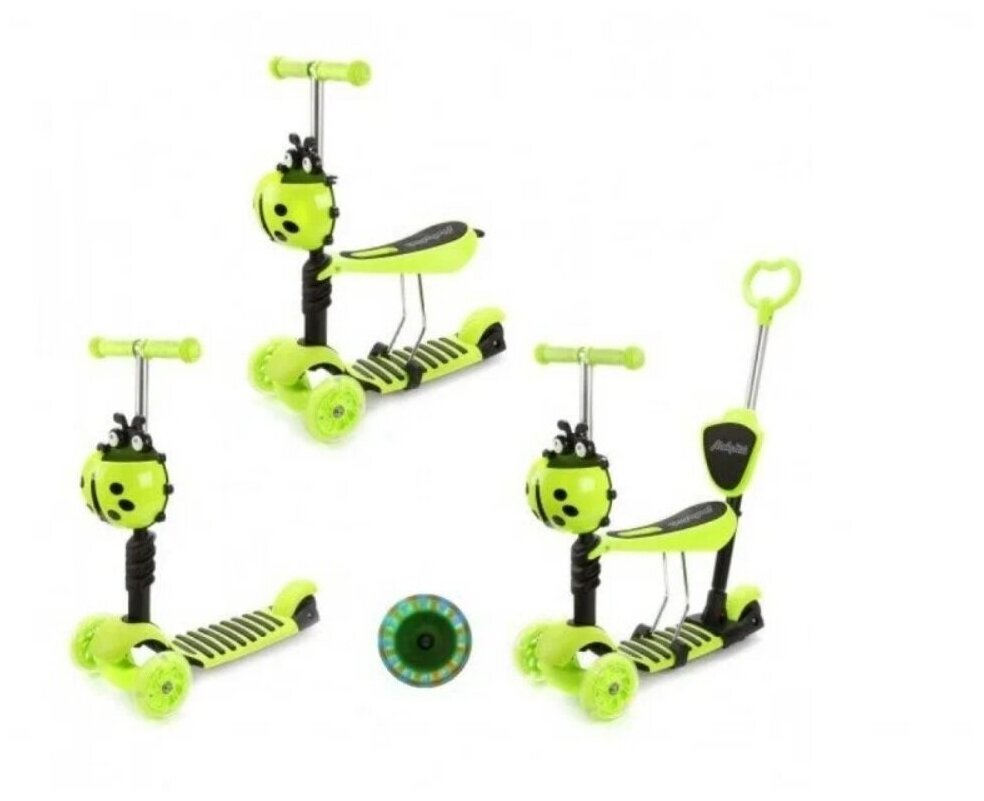 Самокат для малышей "Moby Kids Божья Коровка" 3в1 (зеленый) (с ручкой, светящиеся колеса) информация: