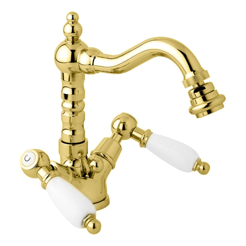 Смеситель для биде с донным клапаном золото 24 карат, ручки белые Cezares First FIRST-BS2-03/24-Bi