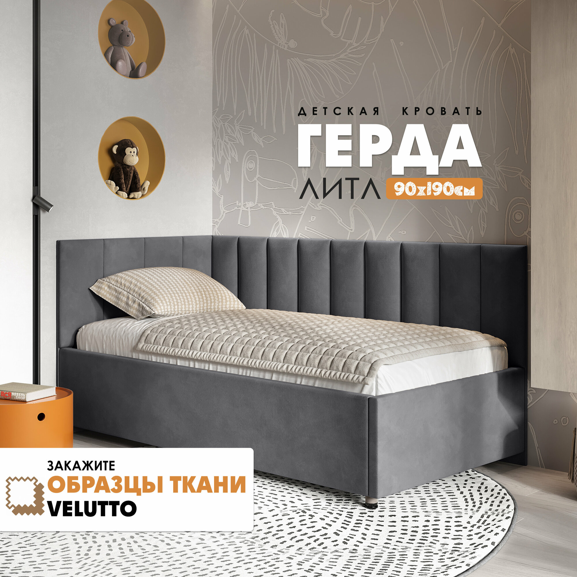 Кровать "Герда Литл" 90х190 (Velutto 32) угол слева информация: