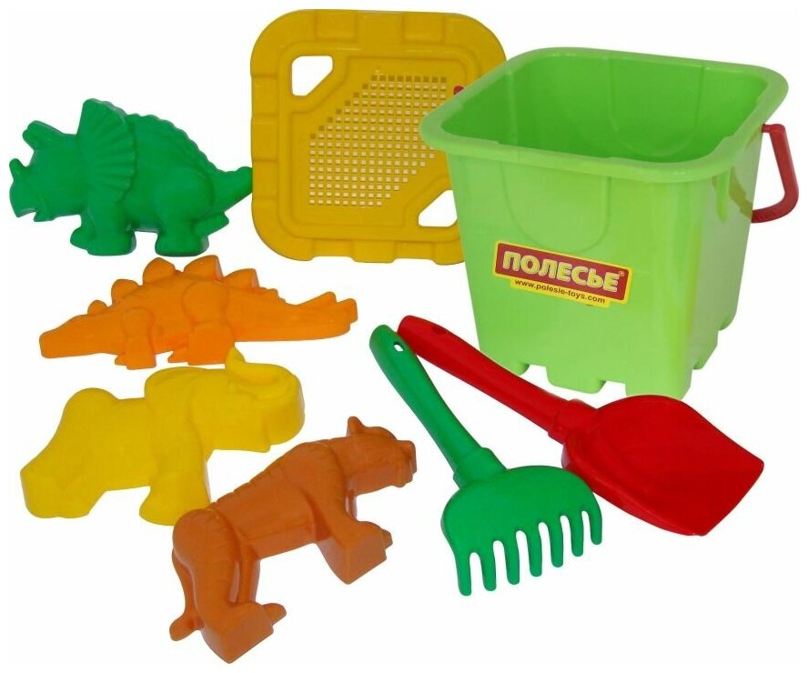 10 цен на Набор №287: ведро-крепость большое, ситечко-крепость большое, лопатка №5, грабельки №5, формочки (тигр + мамонт + динозавр №1 + динозавр №2) П-35493-no