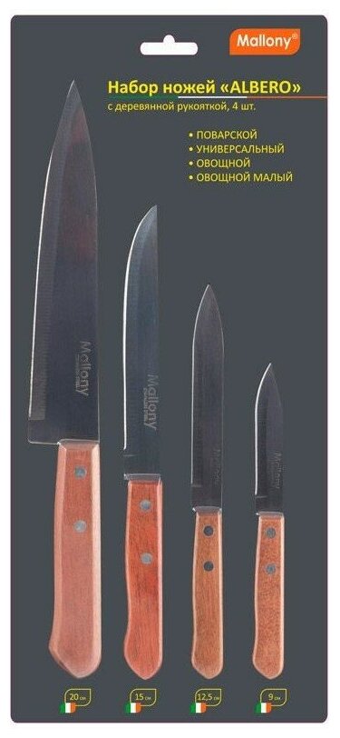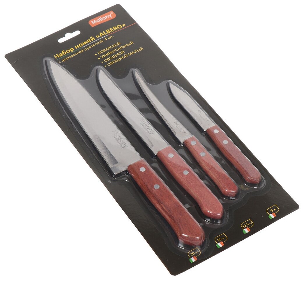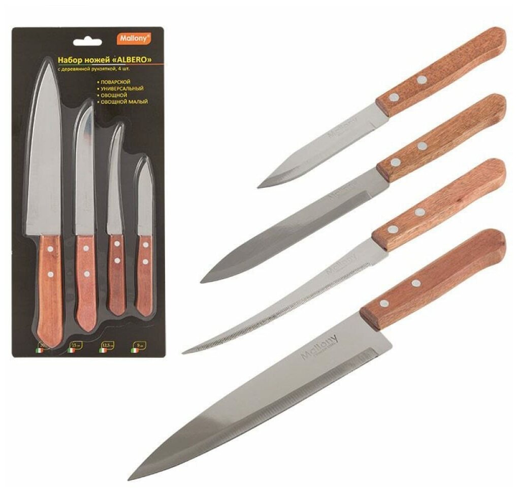 Мы выбрали 10 лучших цен на Набор ножей с деревянной рукояткой ALBERO 4 шт (поварской, универс., овощной, овощной малый) 007092 (Артикул: 4100013792). Перед тем как купить Набор ножей с деревянной рукояткой ALBERO 4 шт (поварской, универс., овощной, овощной малый) 007092 (Артикул: 4100013792) посмотрите найденные предложения из Яндекс Маркета и других сайтов на основе XML фидов.