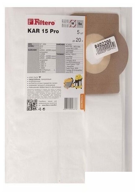 Синтетический трехслойный мешок-пылесборник FILTERO KAR 15 Pro 05637 информация: