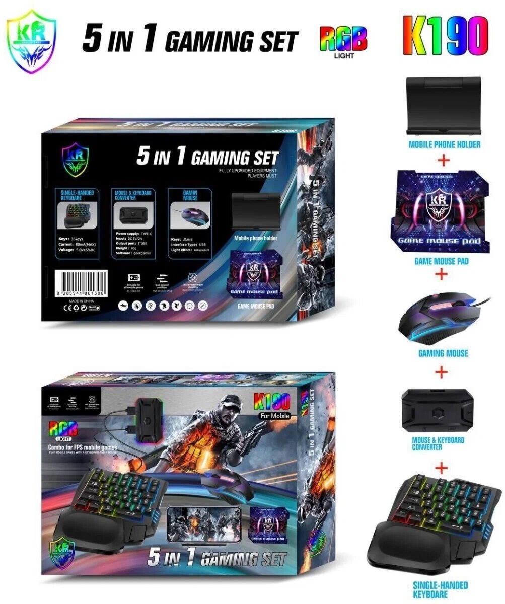Набор геймера к телефону. Игровой набор для телефона 5 в 1. Игровая клавиатура + мышь для игры . Combo for FPS mobile games/RGB подсветка. К190