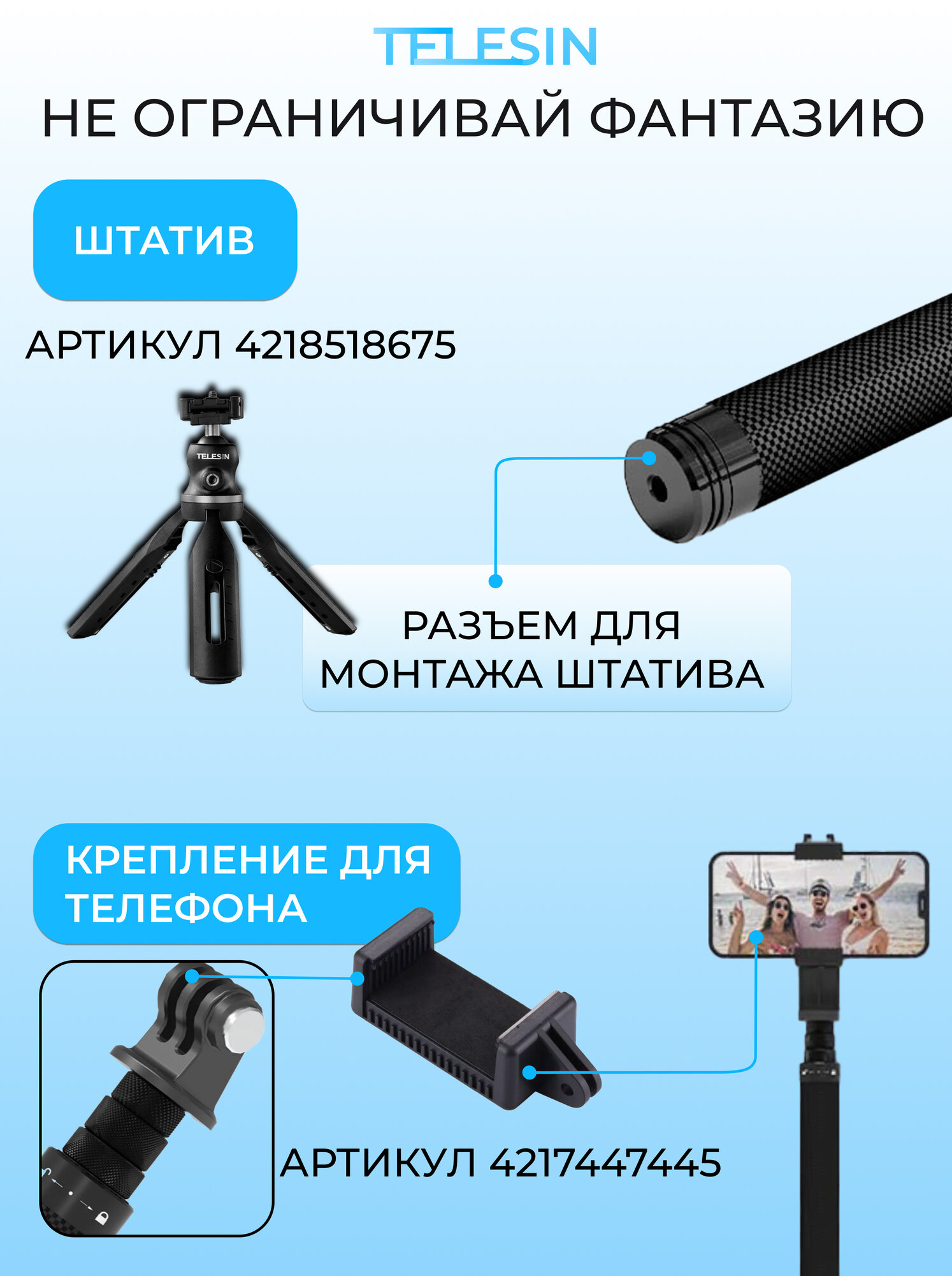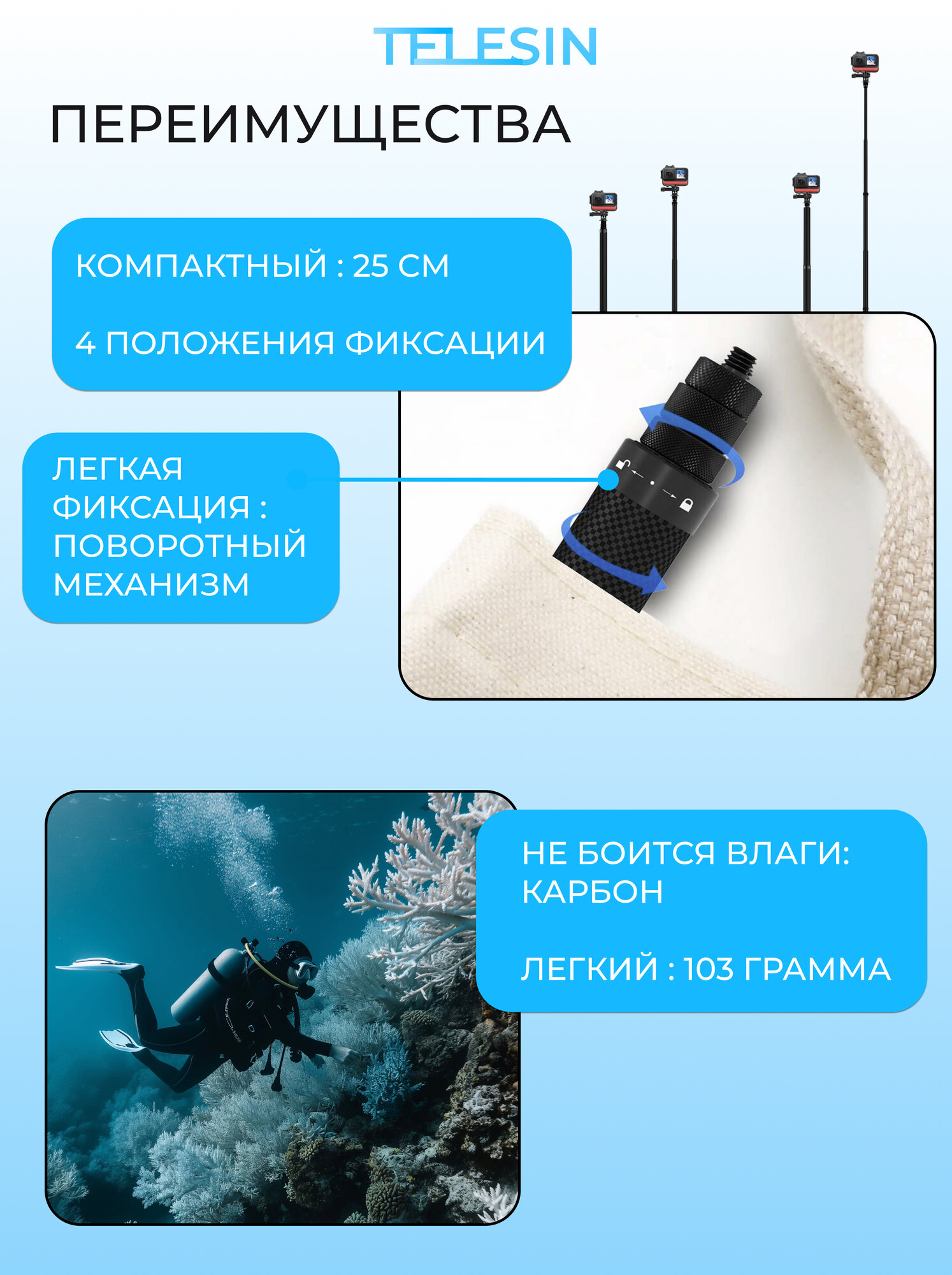 Монопод карбоновый легкий 116 см Telesin информация: