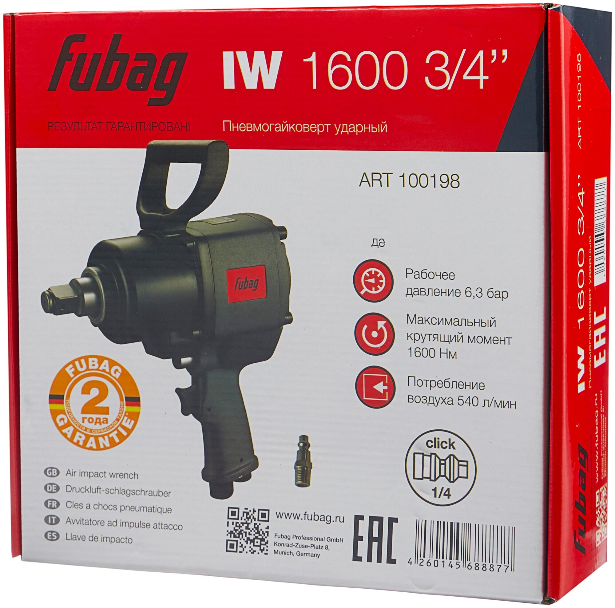 FUBAG Пневмогайковерт ударный IW1600 3/4" (1600Нм_6.3бар_3/4"), шт