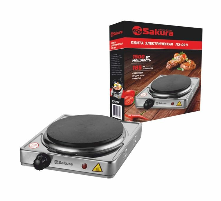10 цен на Электрическая плитка Sakura ПЭ-09Н 1500 Вт, 185 мм, 1 конфорка/диск, нержавеющая сталь РТ-00069381