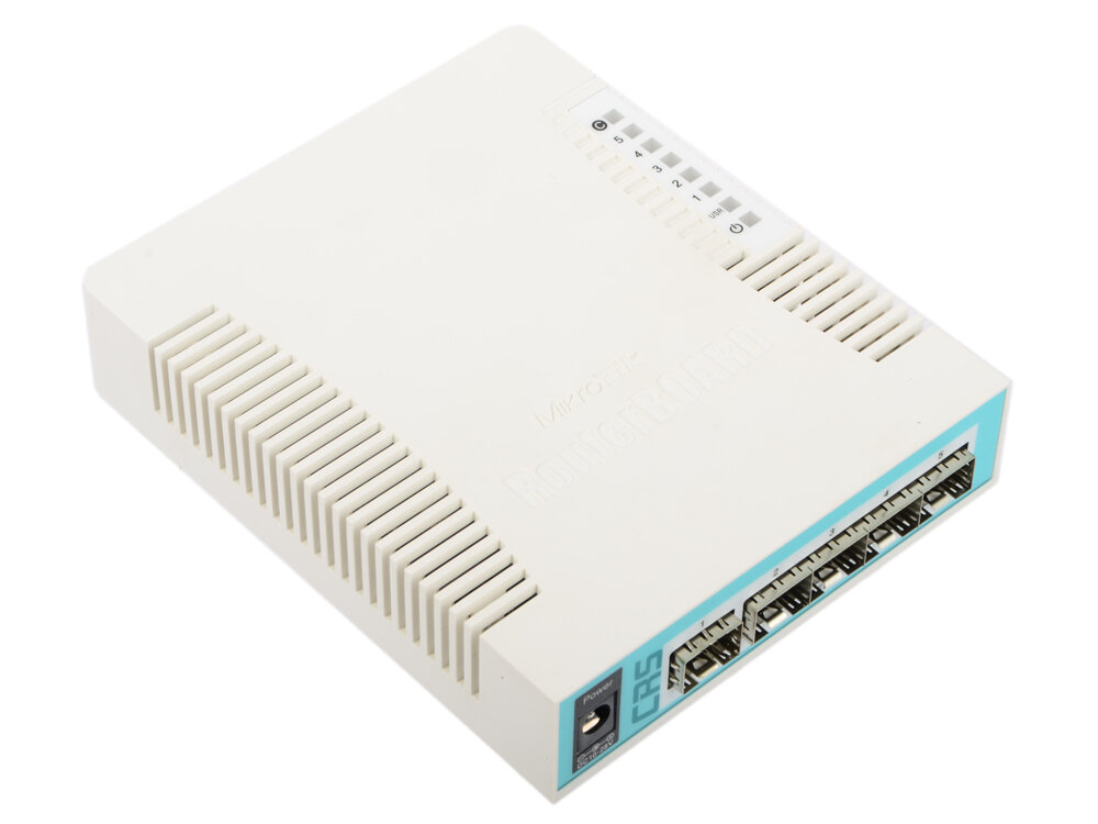 MikroTik Cloud Router Switch 106-1C-5S with QCA8511 400MHz CPU, 128MB RAM, 1x Combo port (Gigabit Ethernet or SFP), 5 x SFP cages, RouterOS L5, deskto