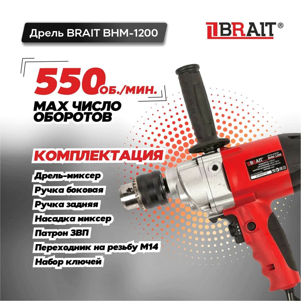 Дрель-миксер BHM-1200 (мощность 1200Вт, напряжение 220В/50Гц, патрон М14, частота вращ. 0-550об/м) информация: