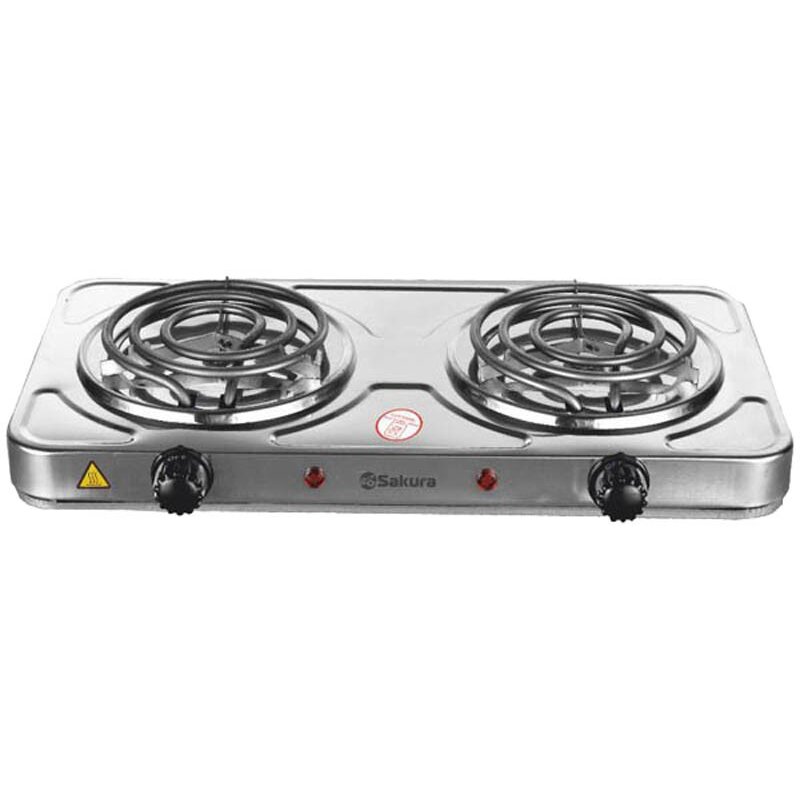 Плитка электрическая Sakura ПЭ-03Н, нержавеющая сталь, 2кВт, 145/145 мм, 2конфорки/спираль