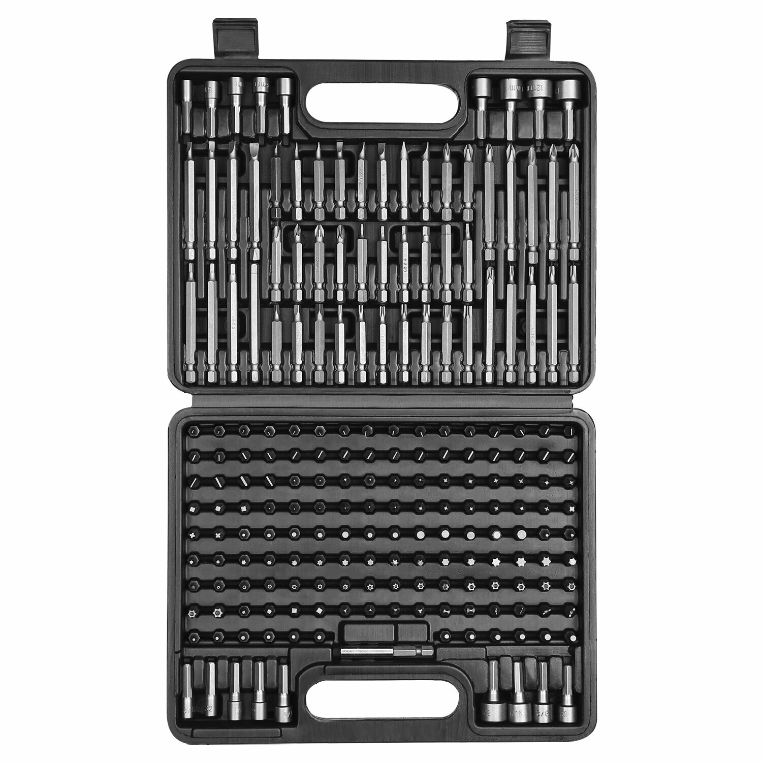 | Биты подробно | 18 х биты 75мм: 5,6,H3,4,5,6,T10,15,20,25,PH1,2,3,PZ1,2,3,SL3,4, 30 х биты 50мм: PH1,2,3,PZ1,2,3,H2,3,4,5,6,S0,1,2,3,T10,15,20,25,27,30,40; SL3*2,4*2,5*2,6*2 140 х биты 25мм: PH0*3,PH1*3,PH2*6,PH3*3,PZ0*3,PZ1*3,PZ2*6,PZ3*3,T8*2,T10*2, T15*2,T20*2,T25*2,T27*2,T30*2,T35*2,T40*2,SL2*3,SL2.5*3,SL3*6,SL4*6,SL4.5*2,SL5*5,SL5.5*1,SL6*5,SL6.5*2,SL7*3, TT8,TT10,TT15,TT20*3,TT25*3,TT27*2,TT30*3,TT35*3,TT40,H2,2.5,H3*2,H4*3,H5*3,H5.5*1,H6*1,S0-1-2-3, TRIWING1-2-3-4,C1,C2,SPANNER4-6-8-10,H5/64*2,H3/32*2,H5/32*2,H7/64*2,H1/8*2,H9/64*2 |