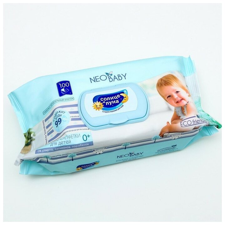 Солнце И луна NEO BABY Влажные салфетки детские 0+ 99% воды big-pack с крышкой 100шт