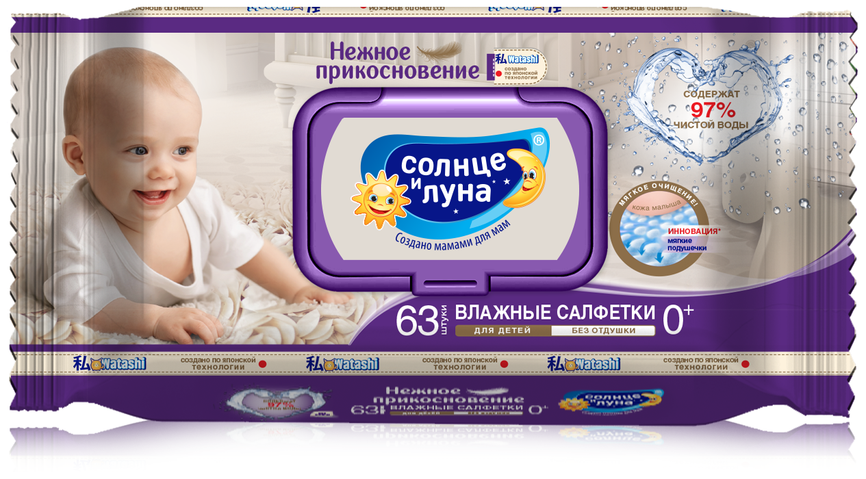 Солнце и Луна Влажные салфетки «Солнце и луна» Нежное прикосновение, детские, с крышкой, 63 шт.