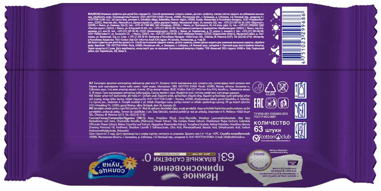 Влажные салфетки, Солнце и Луна, ECO детские 0+ , хлопковые, нежное алоэ и Д-пантенол, 63 шт, 3 уп