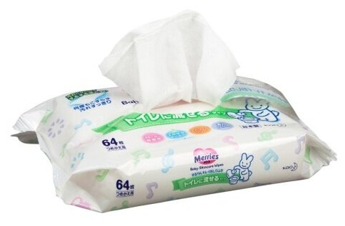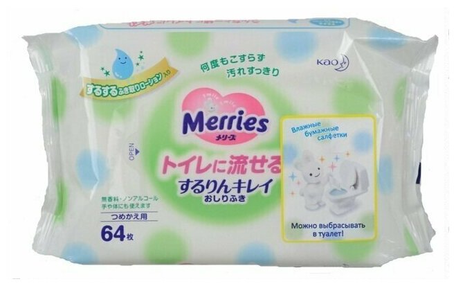 MERRIES Детские влажные салфетки Flushable , Запасной блок. 64 шт.