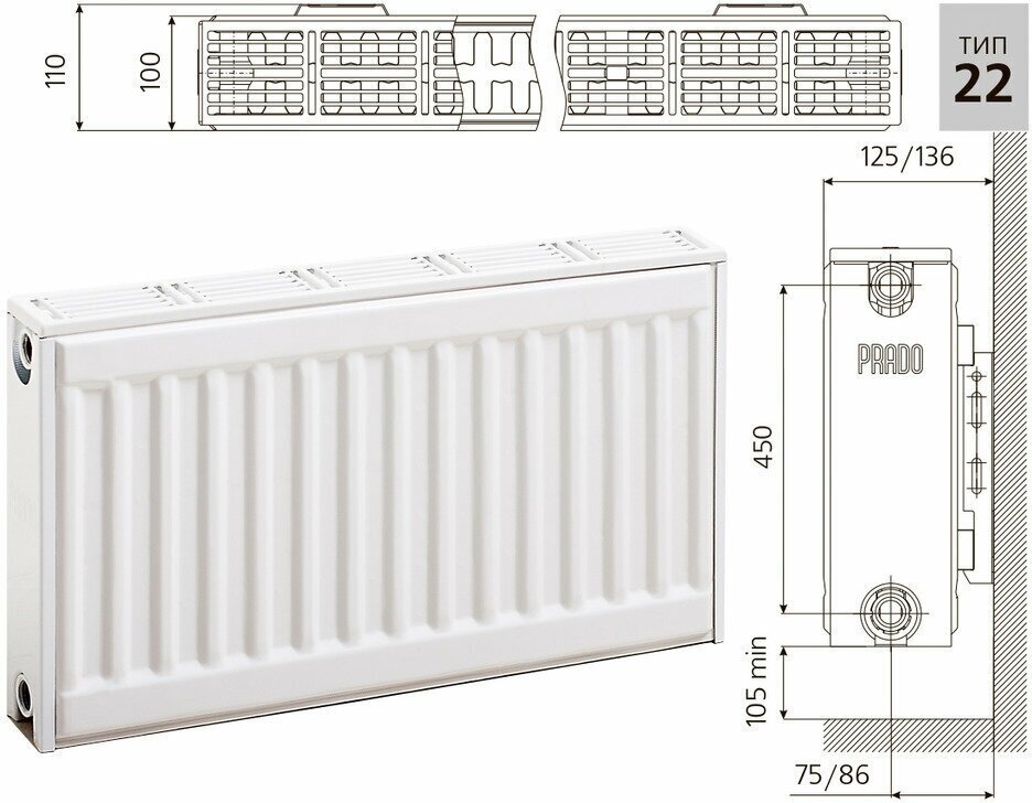 Радиатор стальной PRADO Classic 22/500/700 1512 Вт боковое подключение (+2 кронштейна) информация: