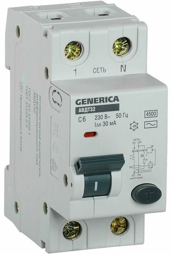 Дифференциальный автомат Generica АВДТ32 2П 30 мА C 4.5 кА AC электронный 6 А информация:
