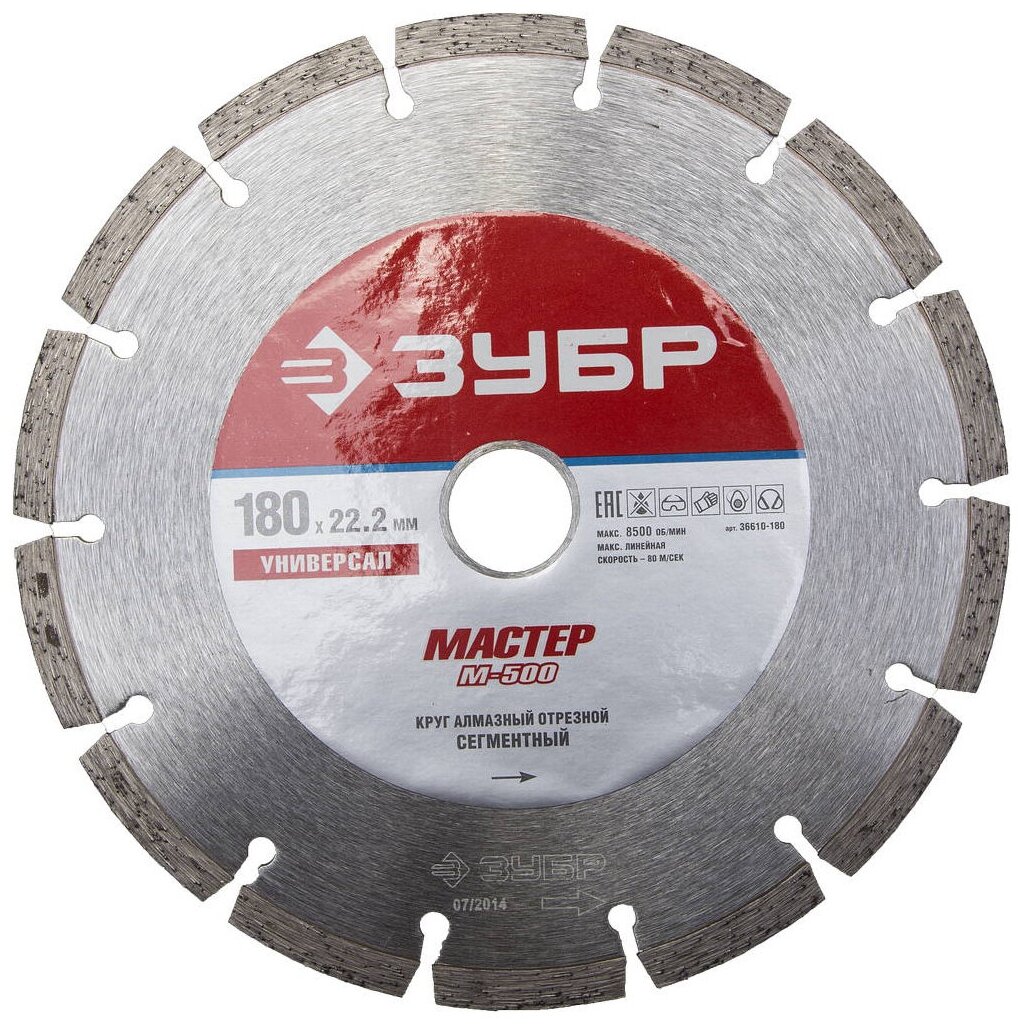 ЗУБР универсал 180 мм, диск алмазный отрезной сегментный, бетон, кирпич, гранит, камень, плитка, черепица (180х22.2 мм, 7х2.2 мм), (36610-180_z01) информация: