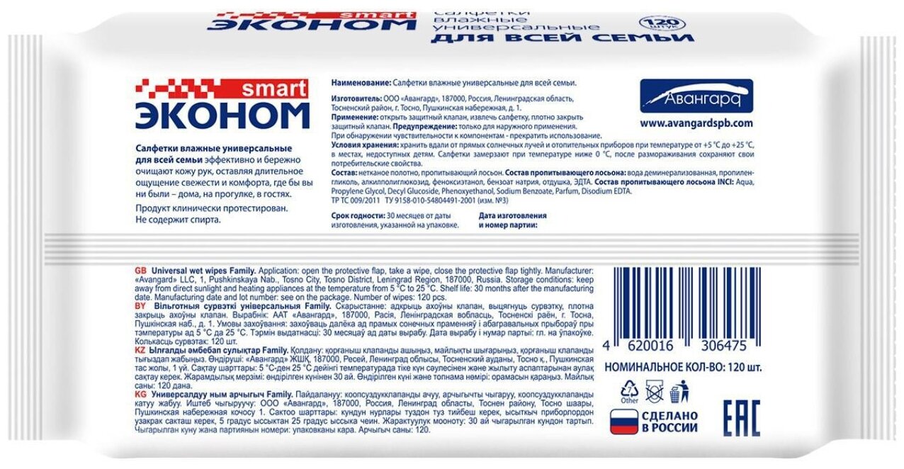 Влажные салфетки авангард эконом Smart, 120 шт, для всей семьи, с пластиковым клапаном