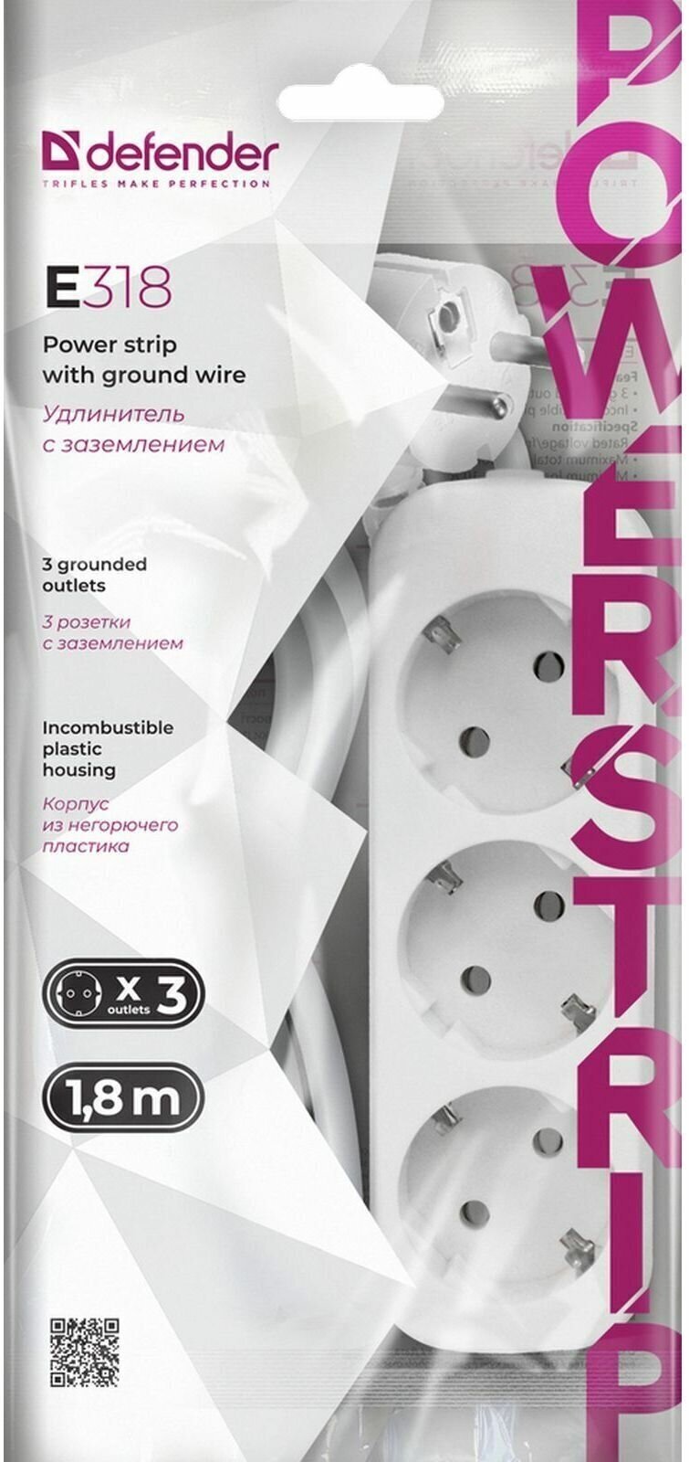 Удлинитель Defender E318, 3 розетки, с заземлением, 1,8м, белый