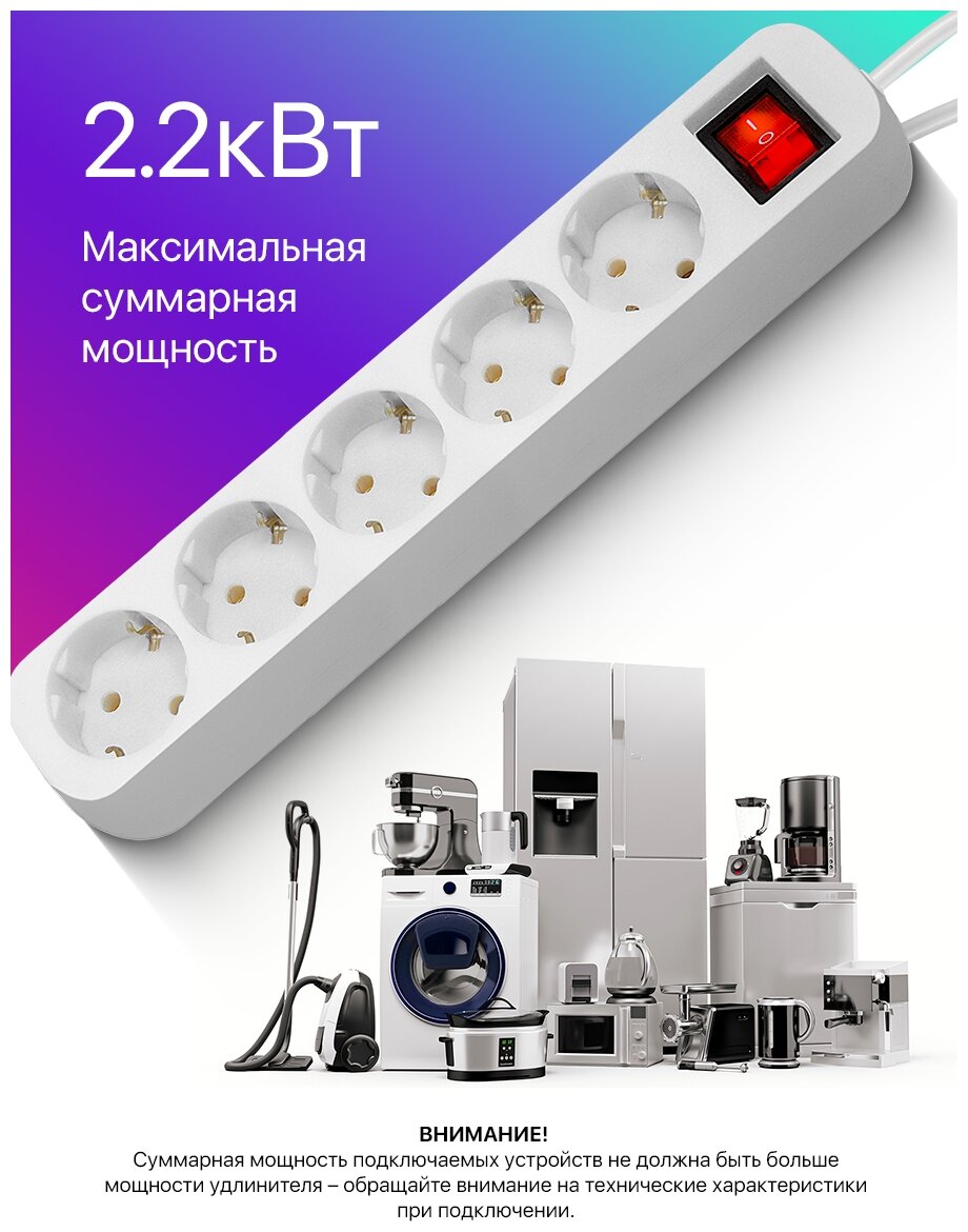 Удлинитель с выключателем Defender S, 3.0 м, 5 розеток, белый