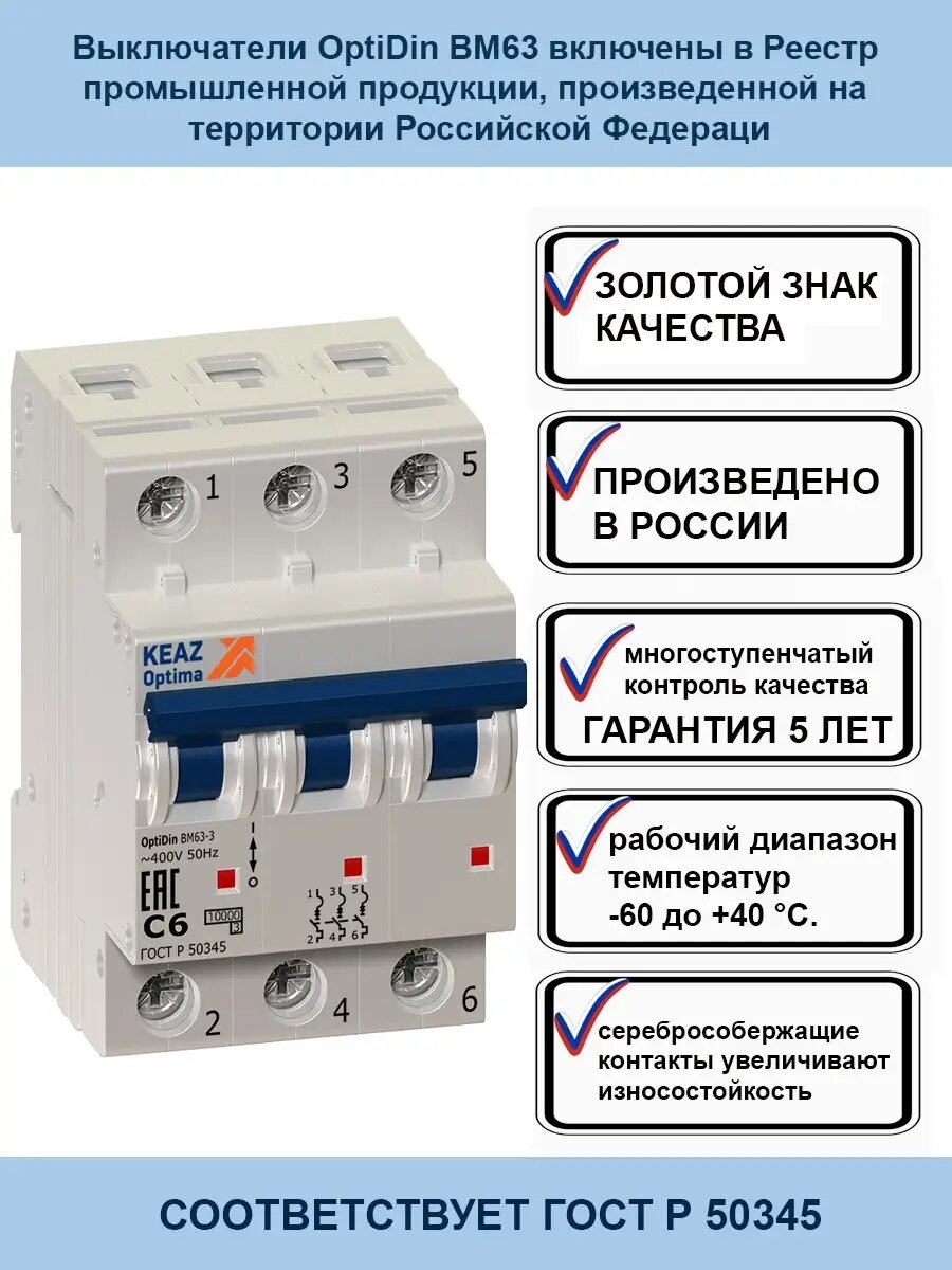 Отзывы на Выключатель автоматический модульный 3п C 6А 6кА OptiDin BM63-3C6-УХЛ3 КЭАЗ 260803