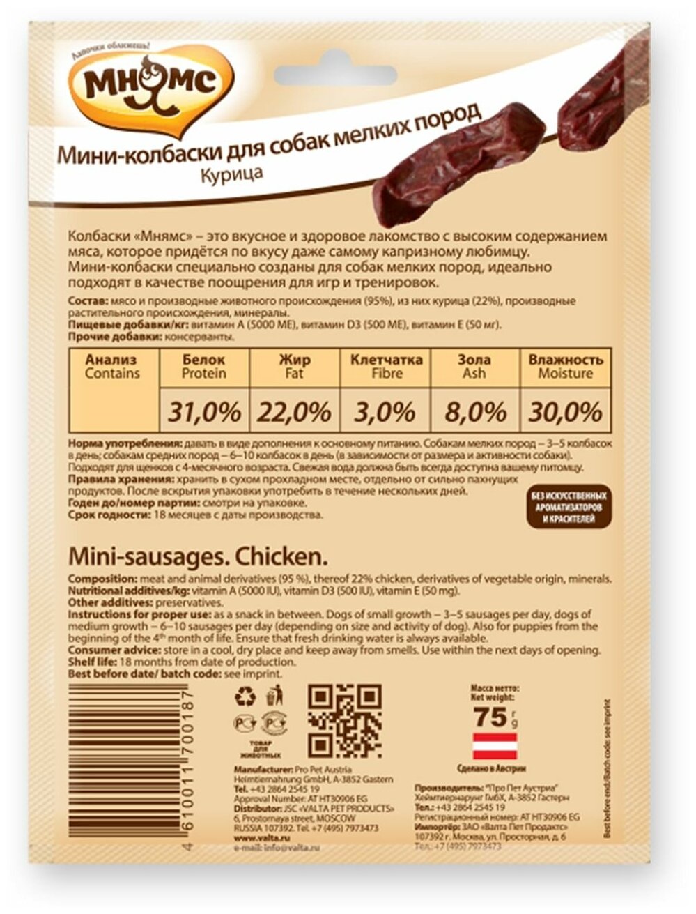 Отзывы на Лакомство мнямс для собак маленьких пород мини-колбаски с курицей (75 гр)