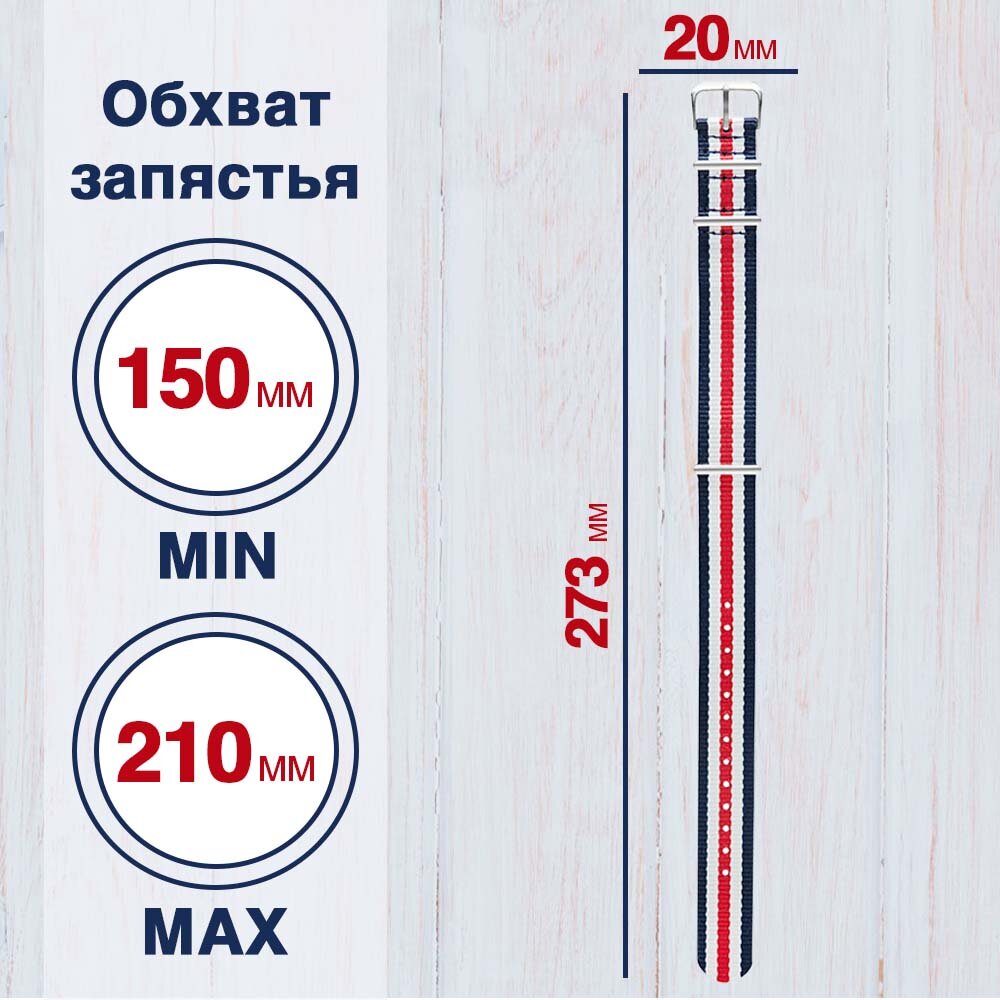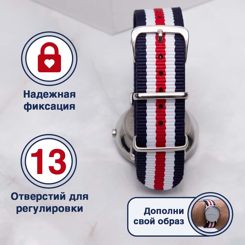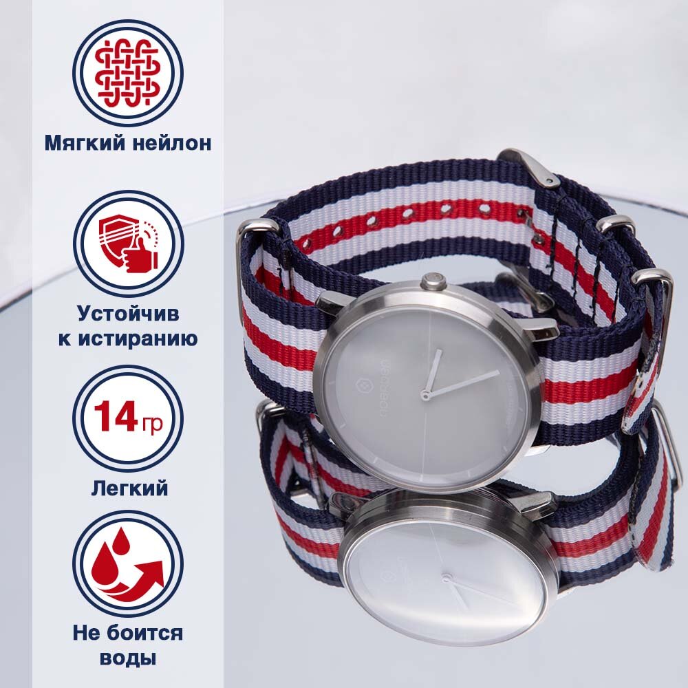 Ремешок для умных смарт часов и фитнес браслетов 20 мм Noerden, Samsung Galaxy Watch, Samsung Gear Sport, Xiaomi Amazfit Bip, Garmin Vivomove Classic, нейлоновый, расцветка НАТО (красный/белый/синий) информация: