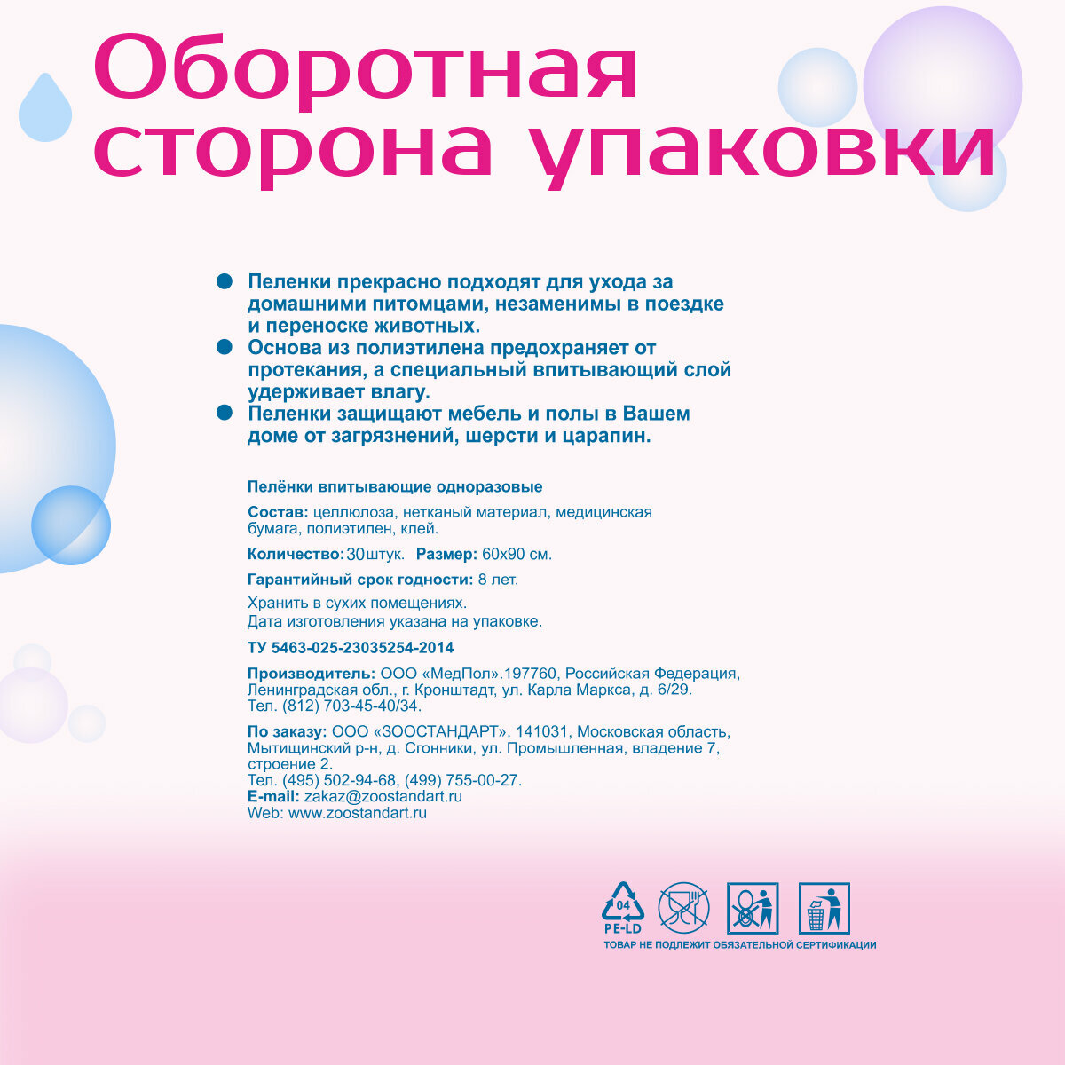 Пеленки впитывающие для животных ZOO няня Комфорт одноразовые гигиенические 60х90 30шт информация: