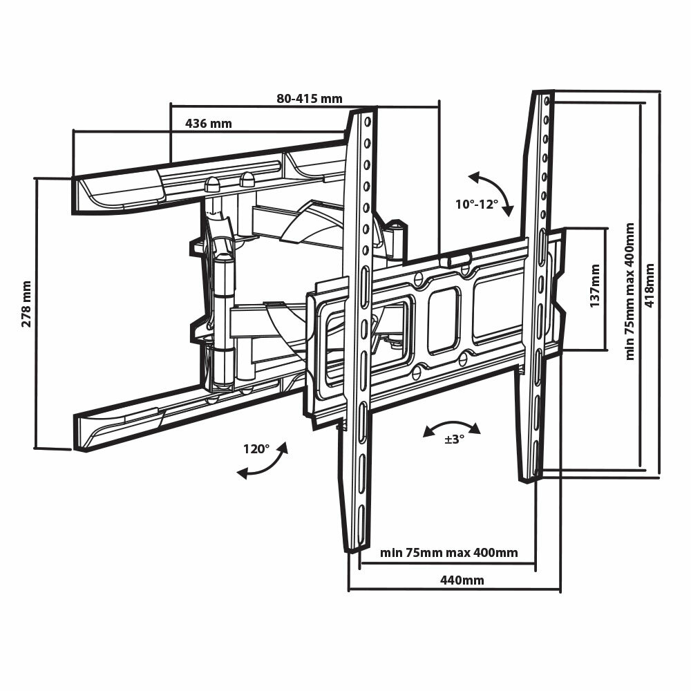 Кронштейн Tuarex OLIMP-407 black, настенный для TV 26-55, поворот 120, наклон +10-12, от стены 72-397мм, макс 35кг, VESA 400x400