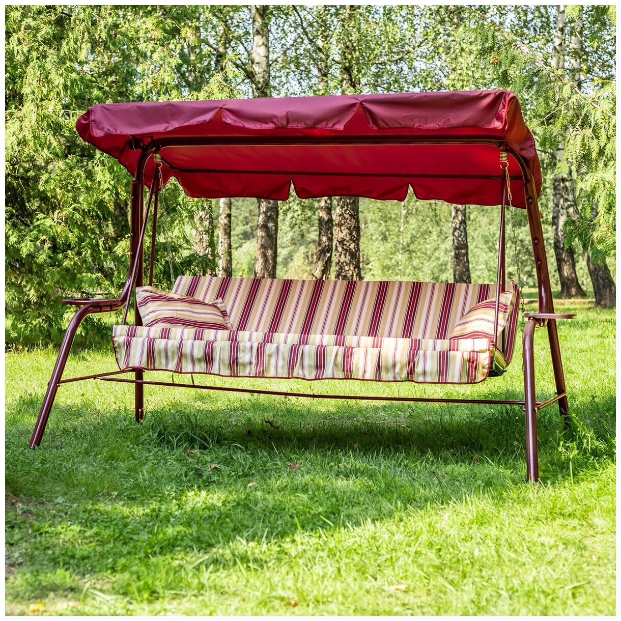 Качели садовые 3-х местные Мебельторг Стандарт Nova Каркас бордовый/Бордовый,бежевый рис.полоска 18 382 ₽