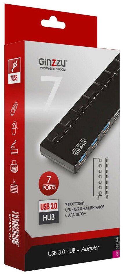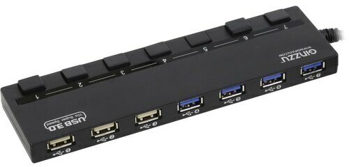Разветвитель USB GINZZU GR-388UAB 7 портов (4xUSB 3.0 + 3xUSB 2.0 + адаптер) черный