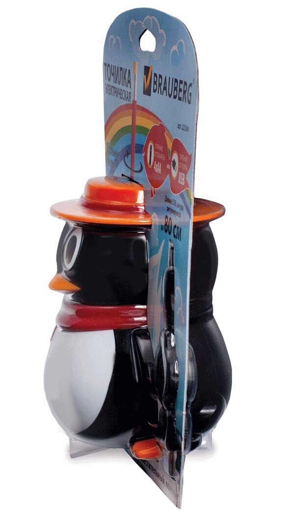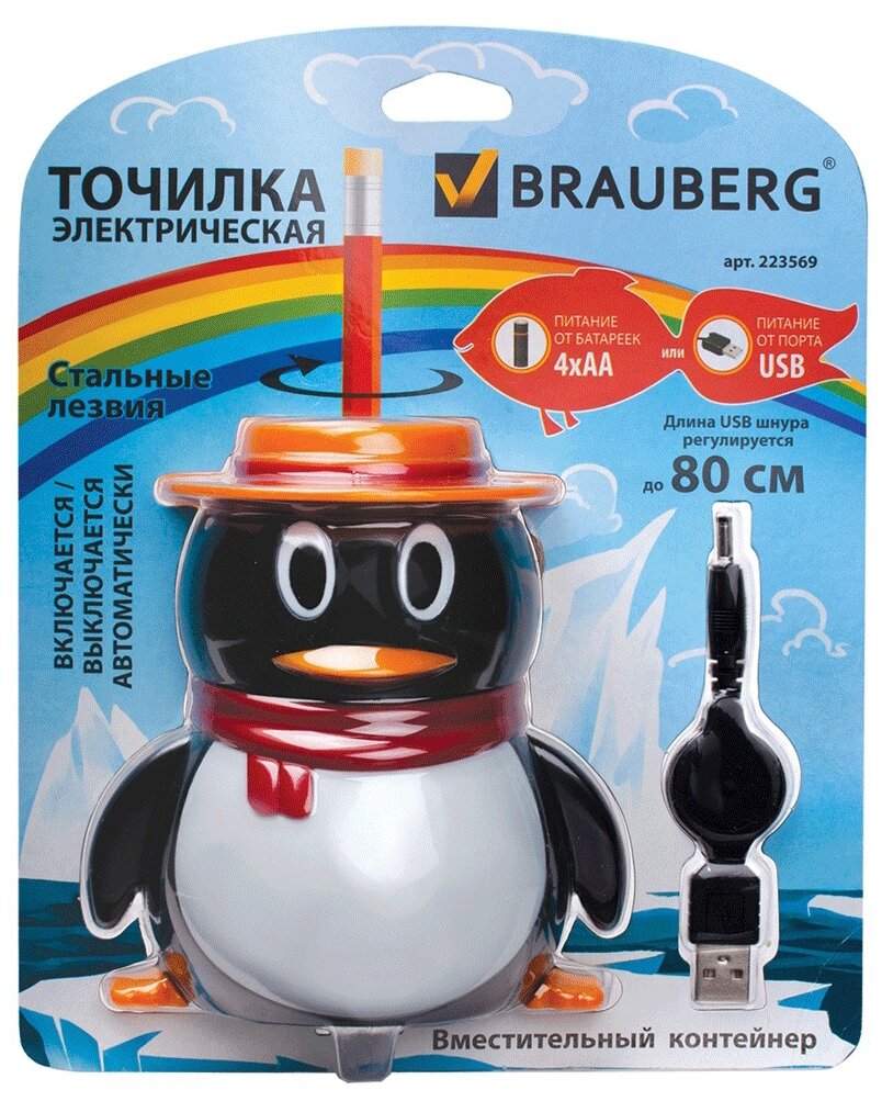 Точилка электрическая BRAUBERG "Пингвин" питание от USB/4 батареек АА, 1 шт информация: