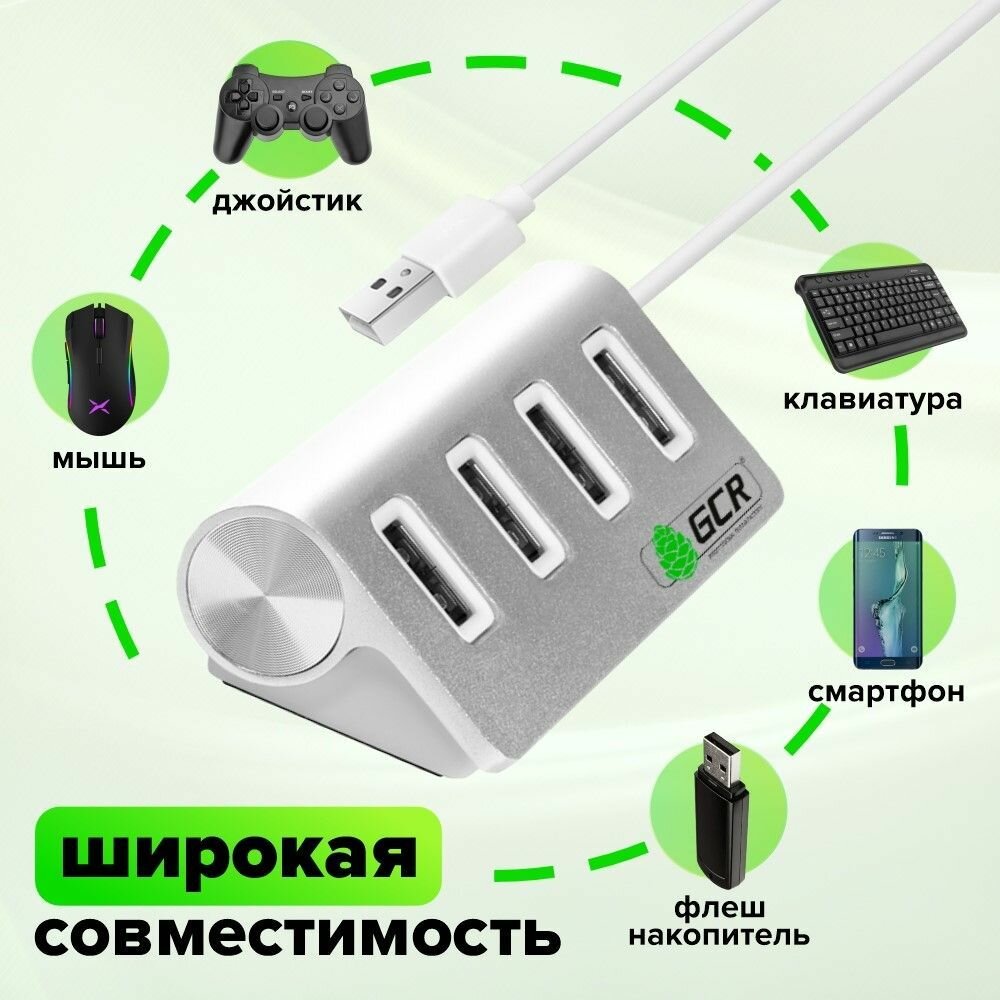 USB разветвитель на 4 порта GCR для ноутбука компьютера телевизора серебристый USB концентратор информация: