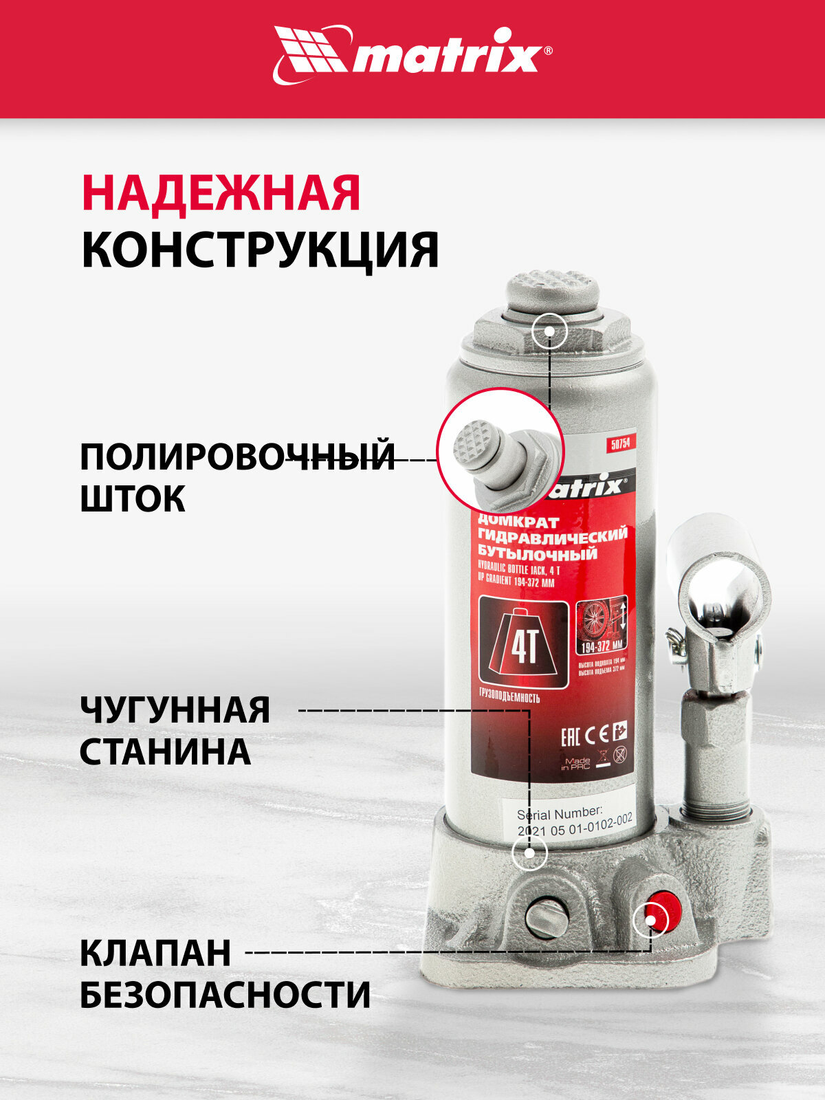 Домкрат гидравлический бутылочный Matrix 4 т, h подъема 194-372 мм, в пласт. кейсе 50754 информация: