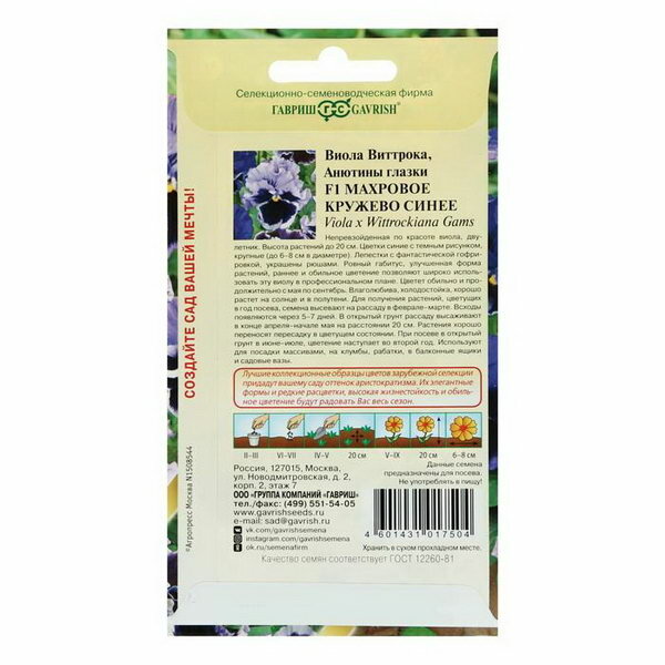 Гавриш Семена цветов Виола Виттрока "Махровое кружево", синяя, Дв., (Анютины глазки) 5 шт. 297 ₽